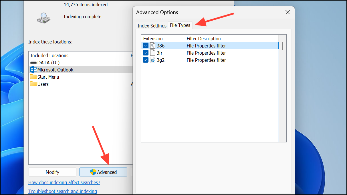 Step 3: In Indexing Options, select Advanced, then the File Types tab.