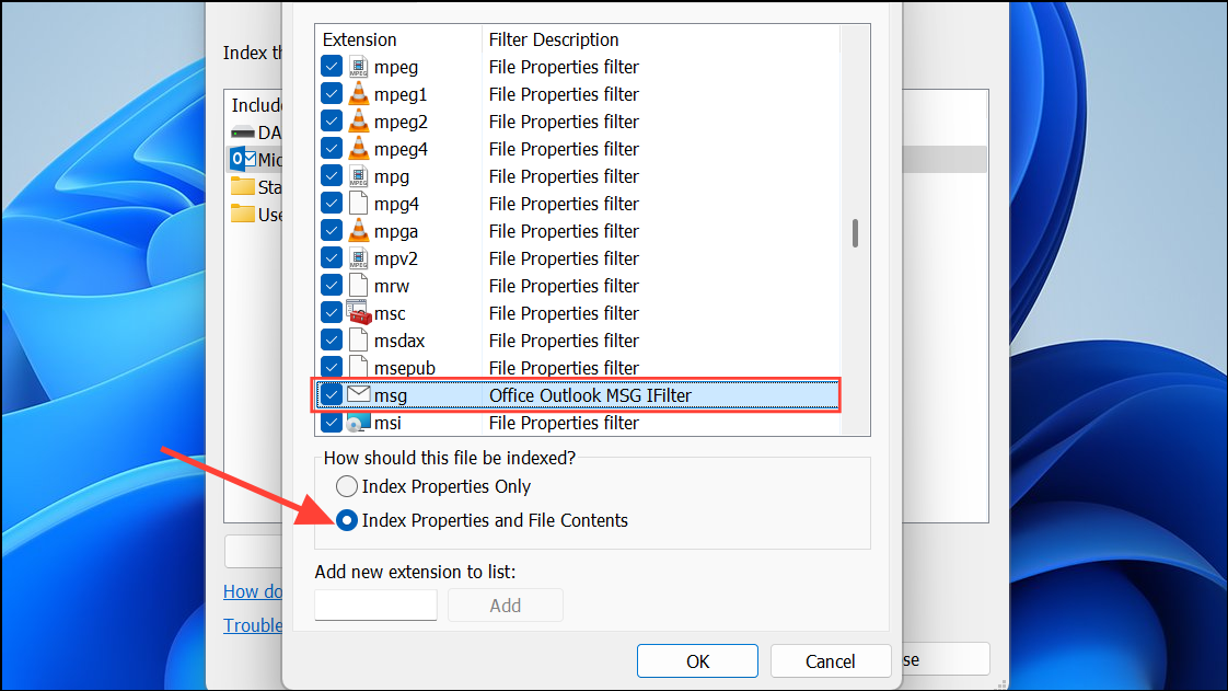 Step 4: Scroll to msg and ensure Index Properties and File Contents is enabled. This setting allows Outlook to search message content, not just headers.