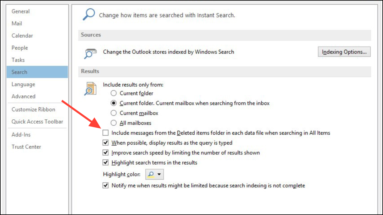 Step 1: In Classic Outlook, go to File > Options > Search. To include deleted items, check Include messages from the Deleted items folder in each data file when searching in All Items and click OK. Restart Outlook.