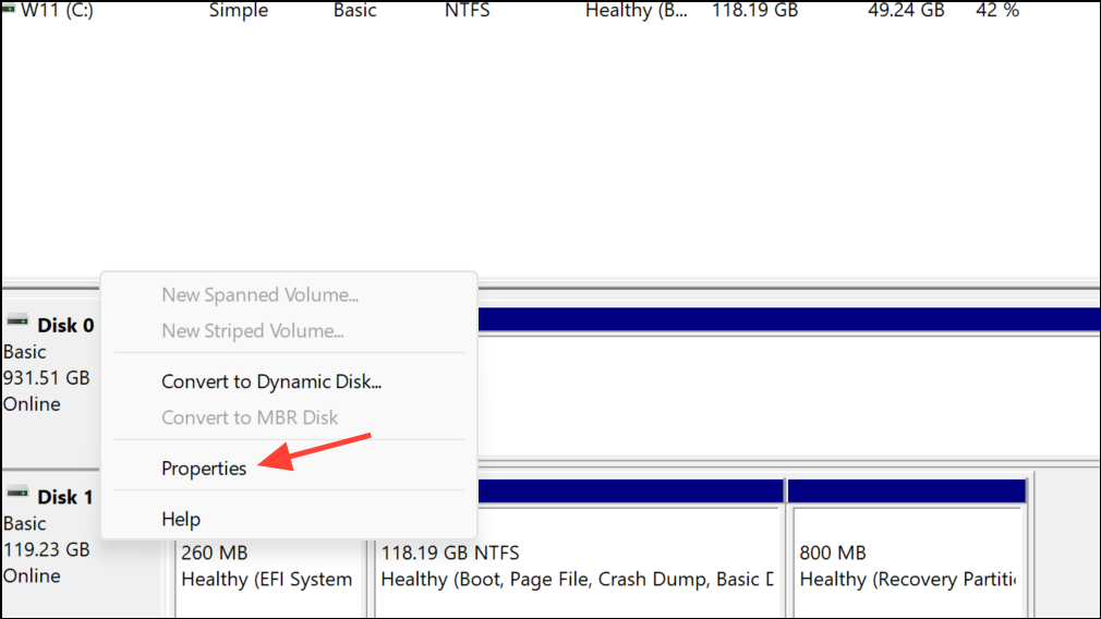 Step 4: Right-click your boot disk (usually C:), select Properties > Volumes.