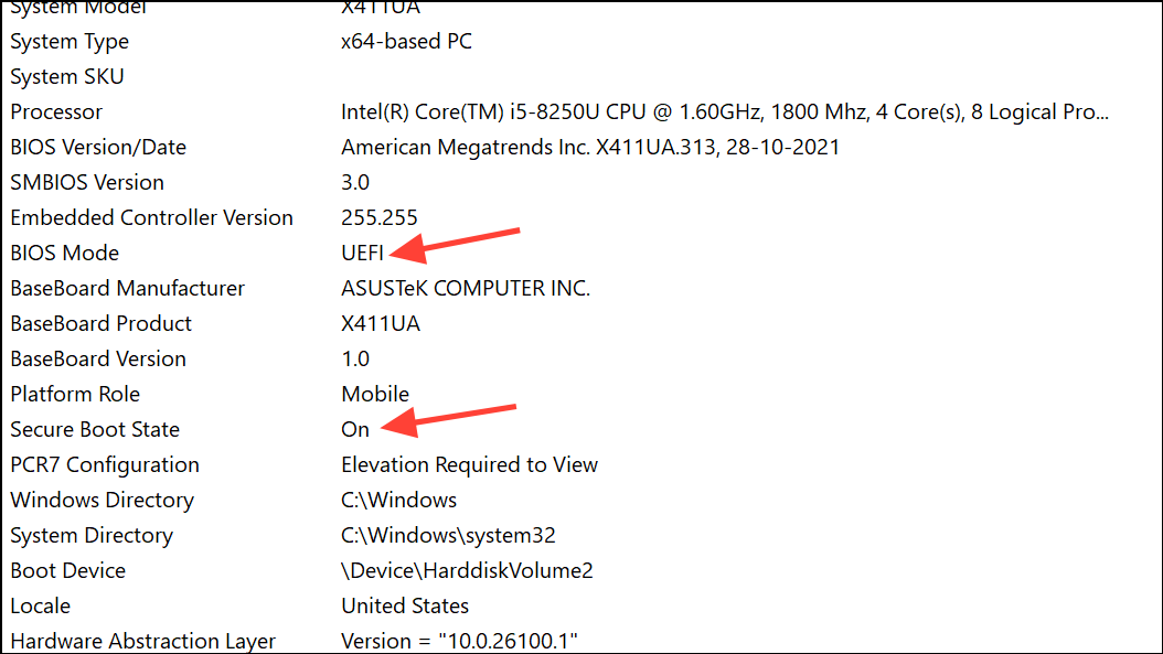 - BIOS Mode: Should display UEFI. If it says Legacy, Secure Boot cannot be enabled without additional changes.