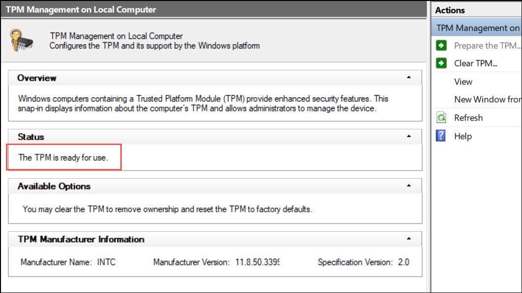 Step 7: Status should read The TPM is ready to use.