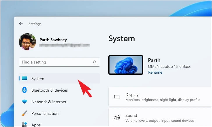 Step 2: In the Settings window, select 'System' from the left sidebar.