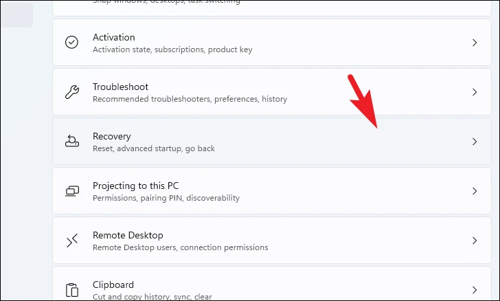 Step 3: Scroll down and click on 'Recovery' in the right pane.
