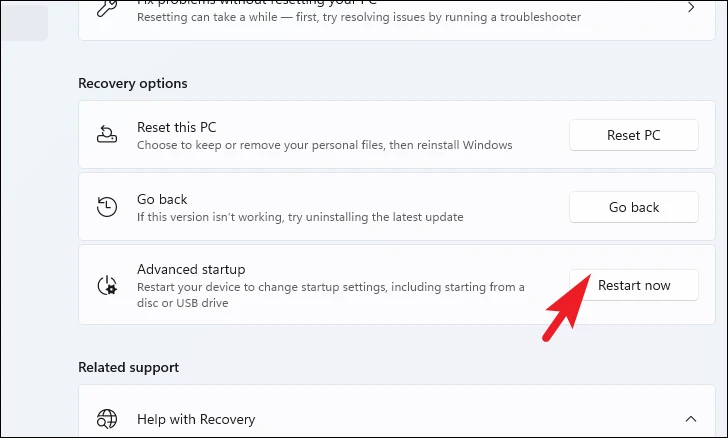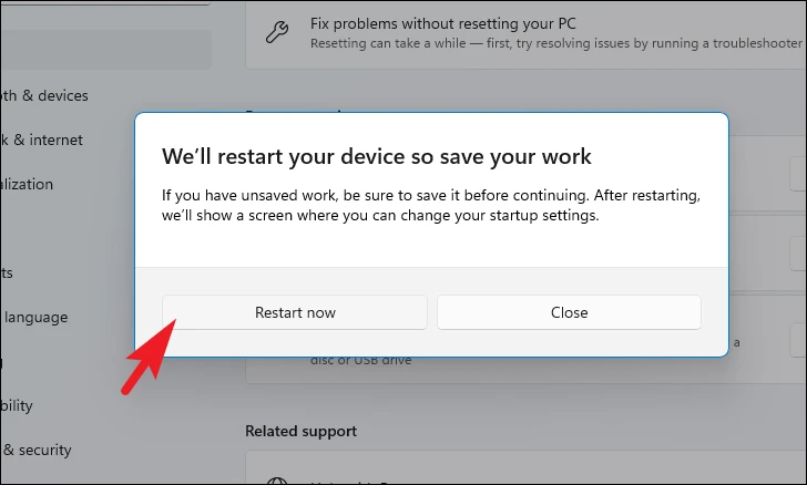 Step 4: Under 'Advanced startup', click on the 'Restart now' button. This will prompt a confirmation dialog.
