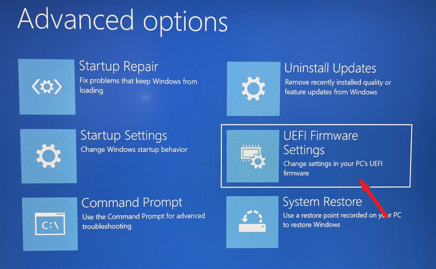 Step 8: Select 'UEFI Firmware Settings' and then click 'Restart'. Your computer will restart and boot into the BIOS/UEFI settings.