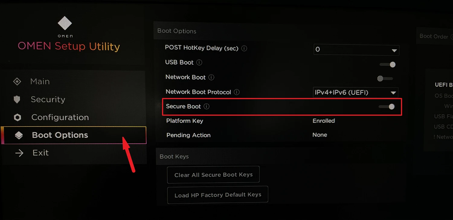 Step 9: In the BIOS settings, navigate to the 'Boot Options' tab. Locate the 'Secure Boot' option and set it to 'Enabled' or 'On'.