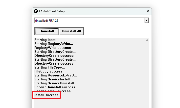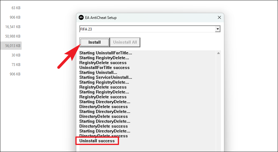 Step 7: Once the uninstallation is complete and you see the 'Uninstall success' message, click on 'Install' to reinstall the Anti-Cheat software.