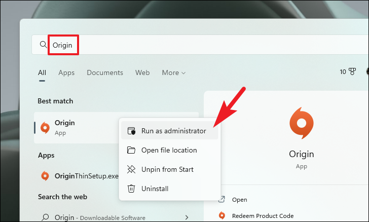 Step 3: Right-click on the game or 'Origin' app from the search results, and select 'Run as administrator'.