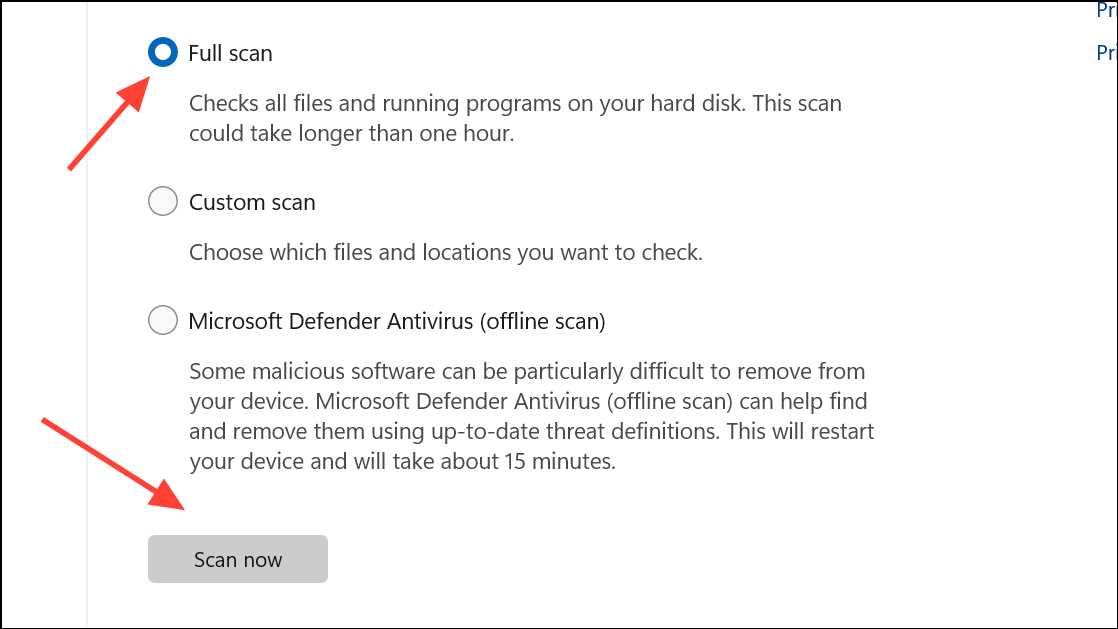 Step 2: Open Windows Security, navigate to Virus & threat protection, and select “Full scan.” Remove any threats detected before attempting installation again.