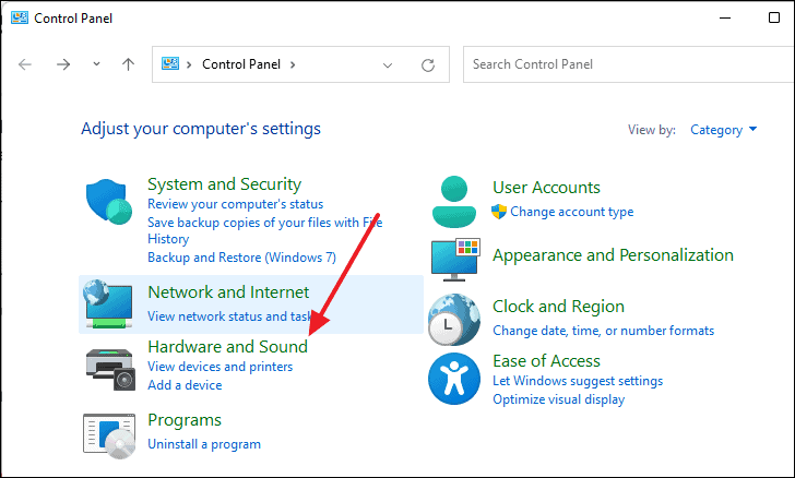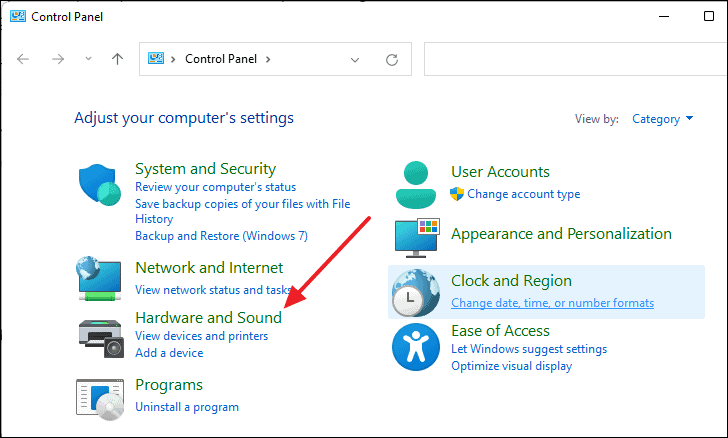 - Click on Hardware and Sound.