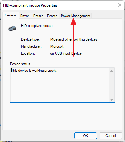 - Navigate to the Power Management tab in the Properties window.