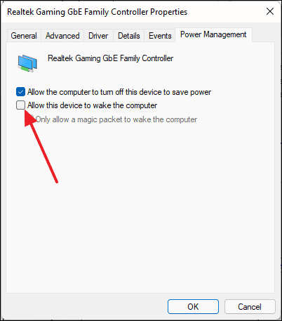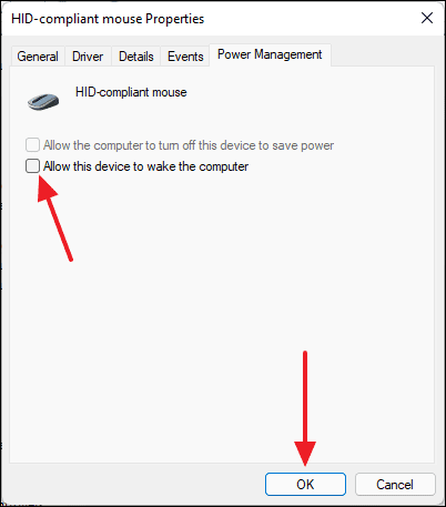 - Uncheck the option Allow this device to wake the computer and click OK.
