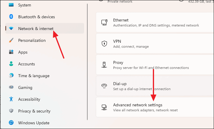 Windows+ion your keyboard. - Select Network & Internet from the left panel and click on Advanced network settings on the right.