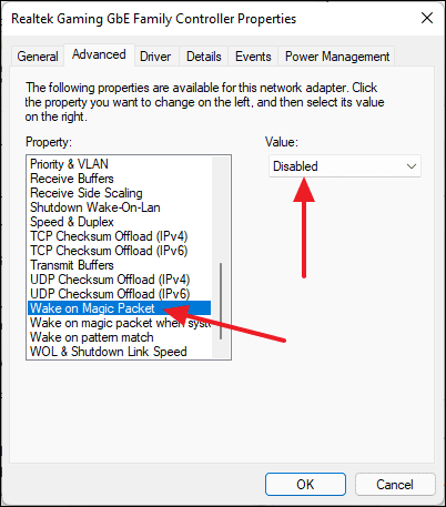 - Switch to the Advanced tab, select Wake on Magic Packet, and set the value to Disabled. Click OK to save the changes.