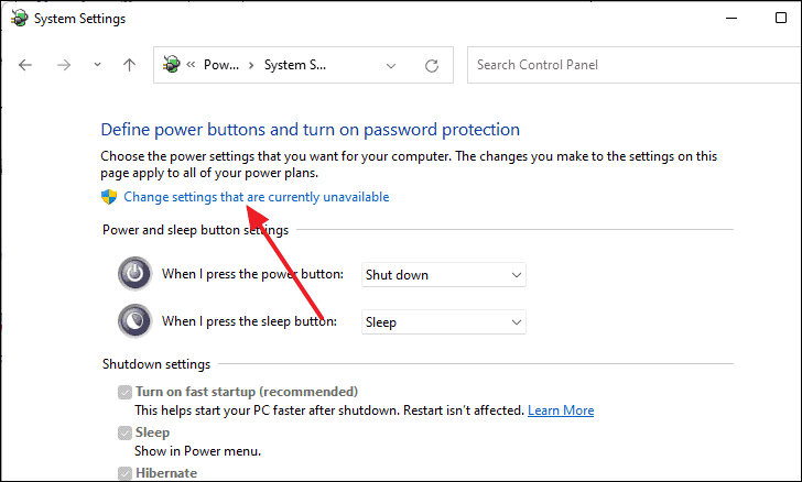 - Under Shutdown settings, uncheck Turn on fast startup (recommended) and click Save changes.