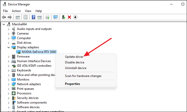 - In Device Manager, right-click on any device (such as your network adapter or graphics card) and select Update driver.