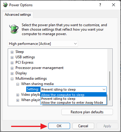 - In the Power Options window, expand Multimedia settings, then expand When sharing media, and set it to Allow the computer to sleep. Click OK to apply the changes.