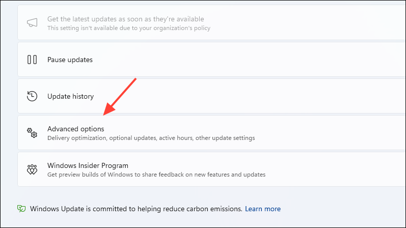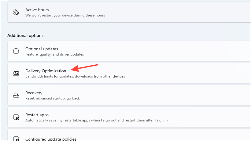 Step 2: Navigate to Windows Update in the left sidebar, then select Advanced Options. Delivery Optimization settings control how Windows manages download bandwidth for updates and the Microsoft Store.