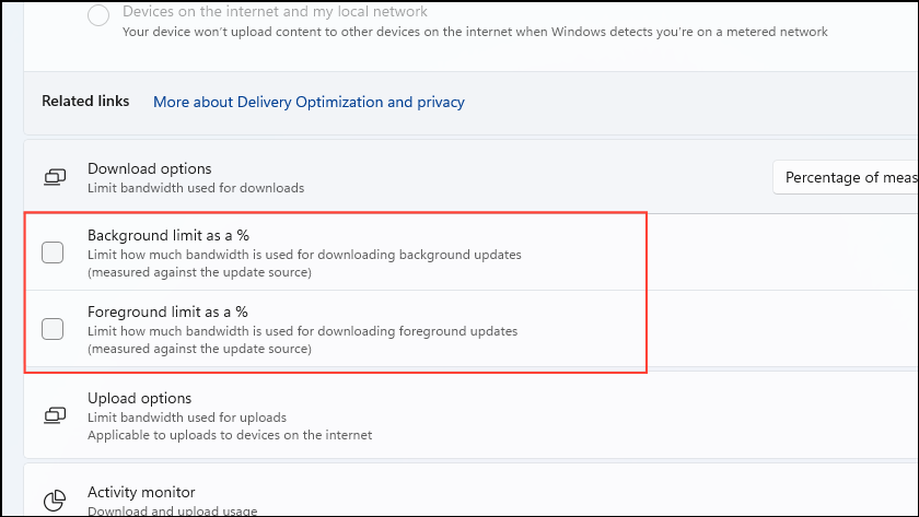 Step 3: Click on Delivery Optimization and then choose Advanced Options within that section. Here, you’ll find bandwidth settings that can restrict download speeds.