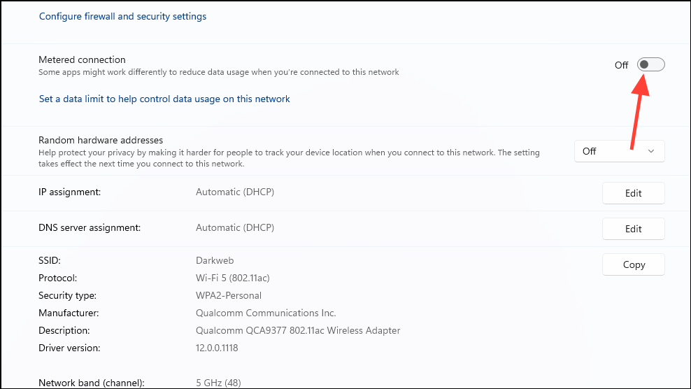 Step 3: Scroll to the Metered connection section and make sure the toggle for Set as metered connection is turned off. This allows Windows and the Microsoft Store to use data without imposed limits.
