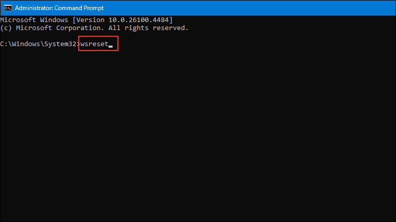 Step 2: In the Command Prompt window, enter wsreset and press Enter. This command clears the Microsoft Store cache without deleting your installed apps or settings. The Store will open automatically when the process is complete.