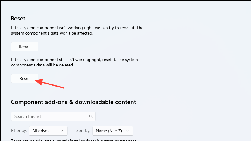 Step 2: In the app settings window, scroll down and click Reset under the Reset section. This process restores the Store to its default state and can resolve persistent glitches affecting downloads.