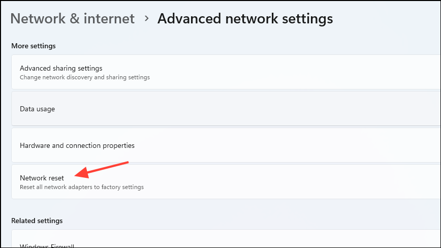 Step 2: Click Network reset and follow the prompts. This will remove and reinstall all network adapters and reset networking components to their defaults. You may need to reconnect to your Wi-Fi network after this step.