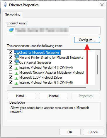 - Click on the Configure button under the adapter's name.