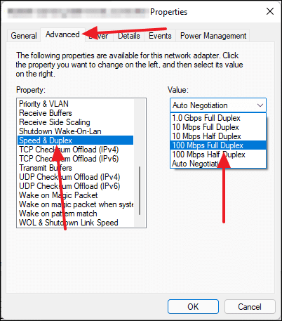 - From the Value dropdown menu, choose 100 Mbps Full Duplex if your network speed is up to 100 Mbps. If your network supports higher speeds, select 1.0 Gbps Full Duplex.