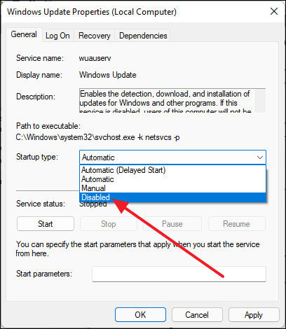 - Set Startup type to Disabled.