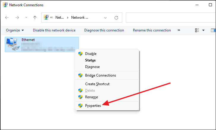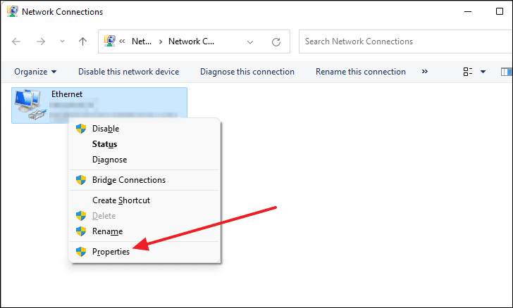 - In the Network Connections window, right-click on your Ethernet adapter and select Properties.