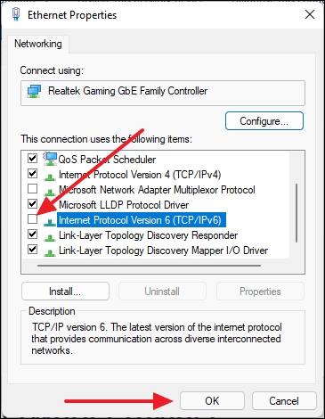 - Uncheck the box next to Internet Protocol Version 6 (TCP/IPv6).