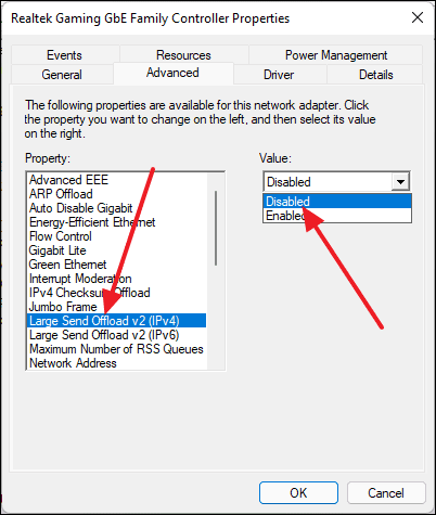 - Select Large Send Offload v2 (IPv4) from the Property list.