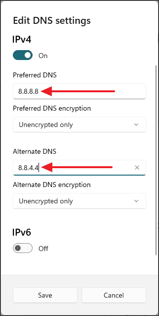 8.8.8.8in Preferred DNS and8.8.4.4in Alternate DNS.