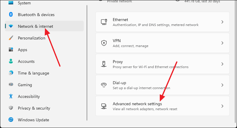 - In the Settings window, select Network & internet from the left pane, then click on Advanced network settings on the right.