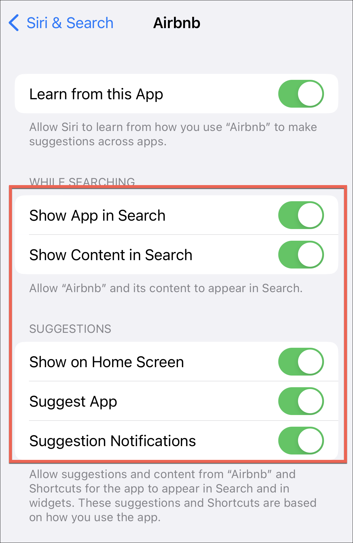 Then, turn on the toggles for ‘Show App in Search’ and ‘Show Content in Search’ under the While Searching section. Also enable the toggles for ‘Show on Home Screen’, ‘Suggest App’, and ‘Suggest Notifications’ under the Suggestions section. Note that not all apps would have all these options; just enable the options the app does have.