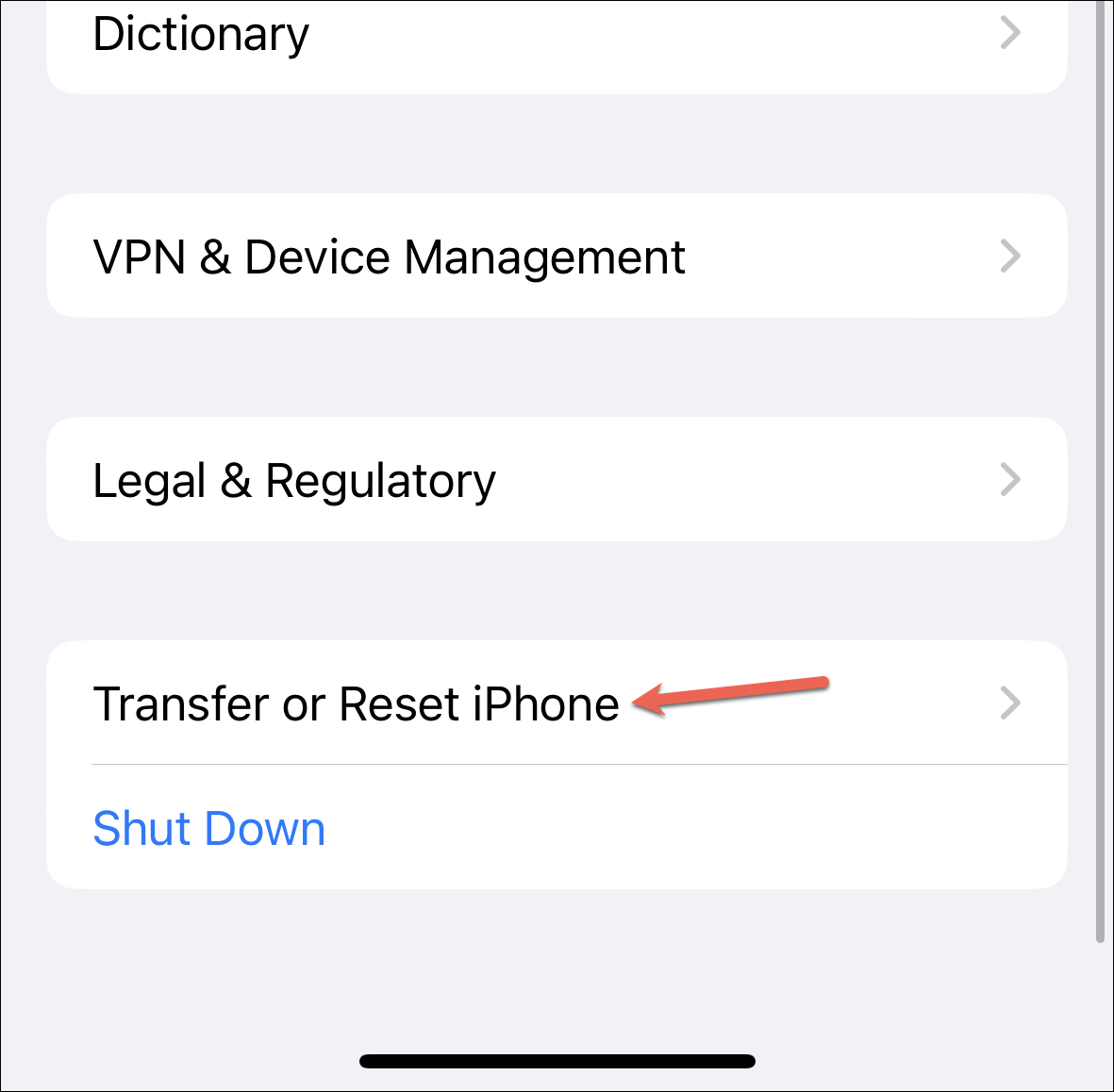 Then, scroll down and tap the ‘Transfer or Reset iPhone’ option.