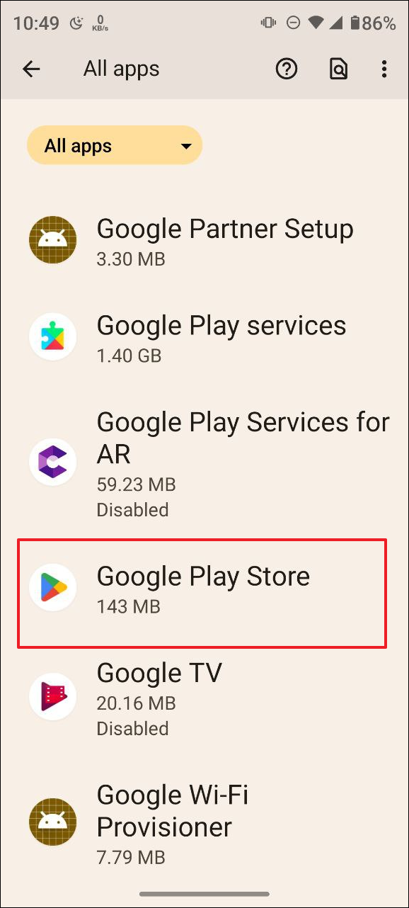 - When the list of apps appears, tap on Google Play Store.