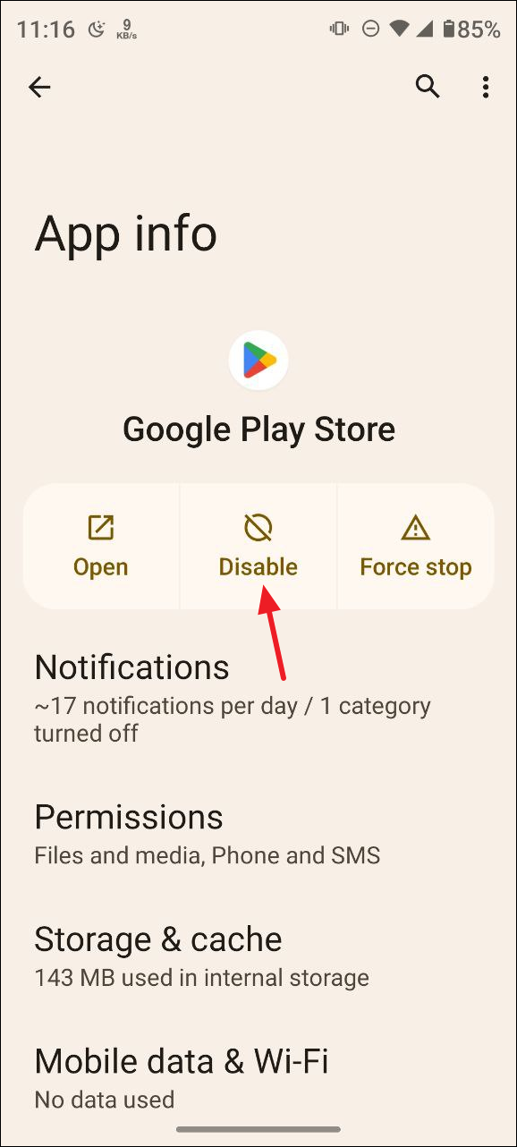 - Open the Apps page in the Settings app and tap on Google Play Store as previously explained.