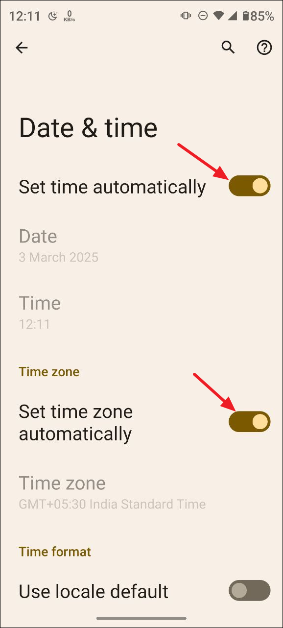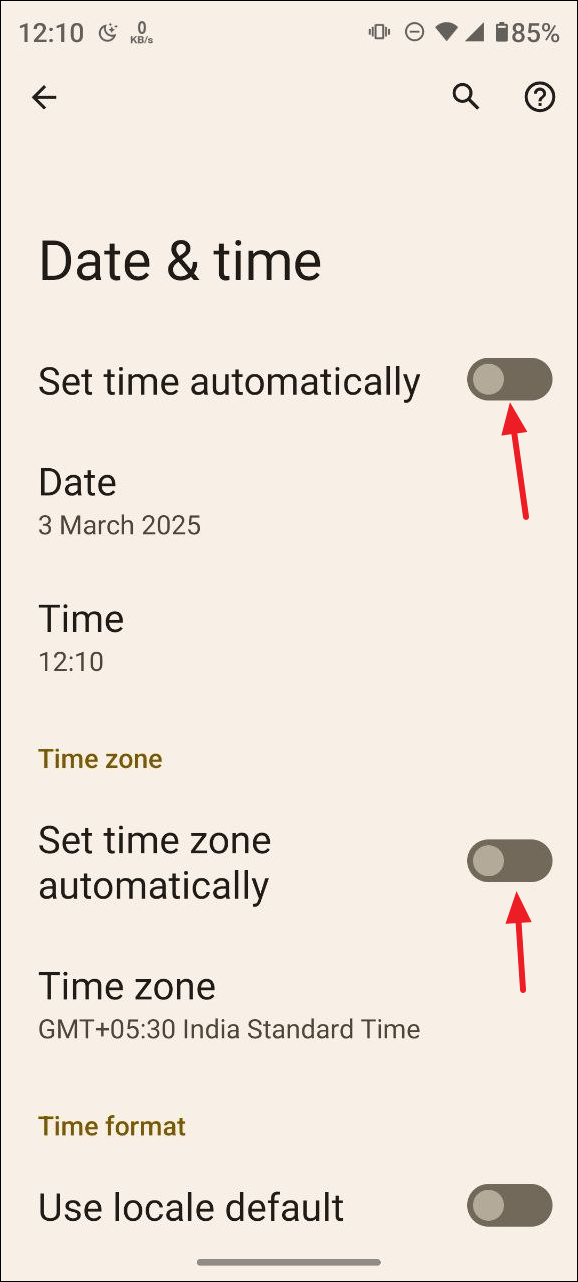 - Next, tap on the 'Set time automatically' and 'Set time zone automatically' toggles to disable them.