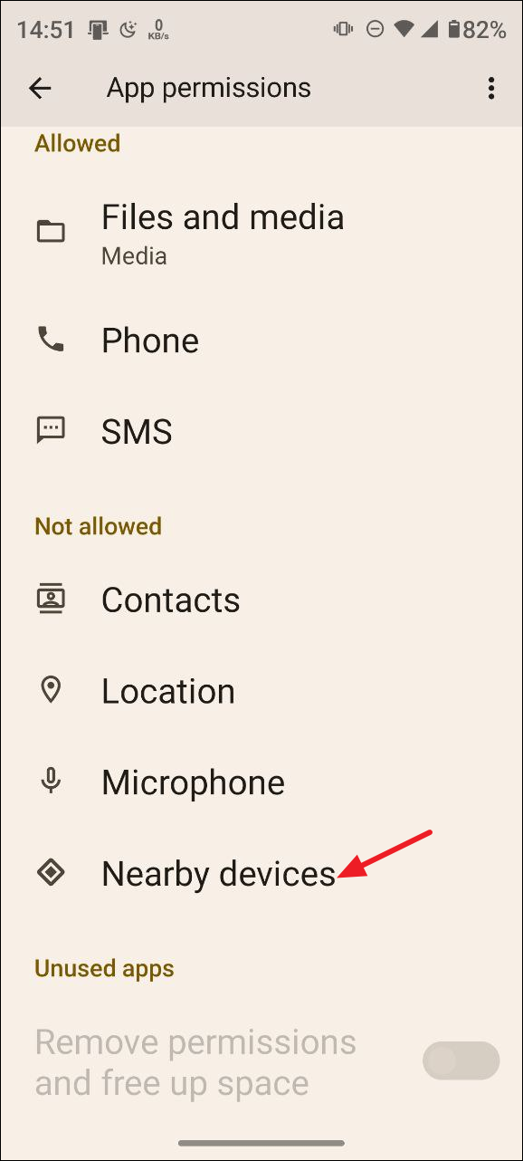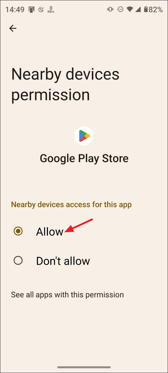 - Make sure the Play Store has access to all the permissions it requires. To grant permission for a certain item, such as 'Nearby devices', tap on it.