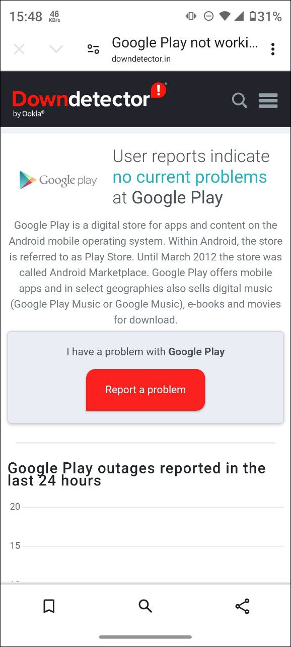 Before you try fixing the problem causing the error, you should check the status of the Google Play server. You can do so using third-party services, like Downdetector, or with the Google dashboard directly. If the server is experiencing issues, you may run into various problems that can cause the 'Something went wrong' error. In such instances, there is nothing you can do and you will have to wait until the problem with the server gets fixed. On the other hand, if the server is running properly, you can try out the various fixes listed here.