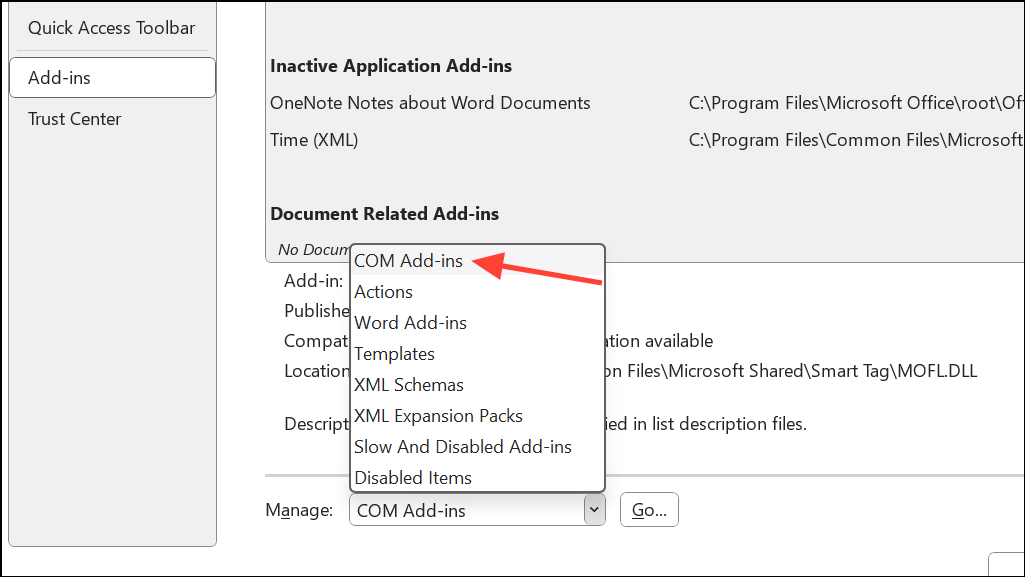 Step 3: Click Go next to COM Add-ins and uncheck all add-ins. Re-enable them one by one to identify the culprit.
