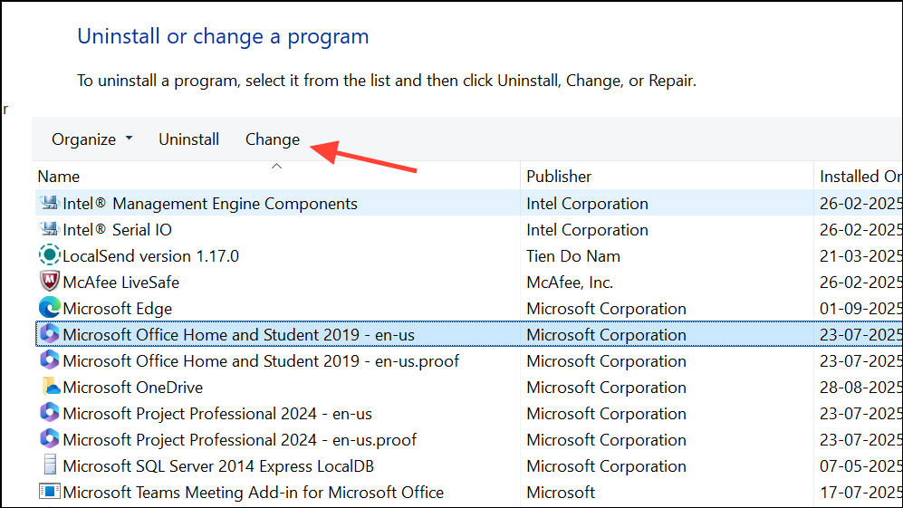 Step 3: Select Microsoft Office and click Change.