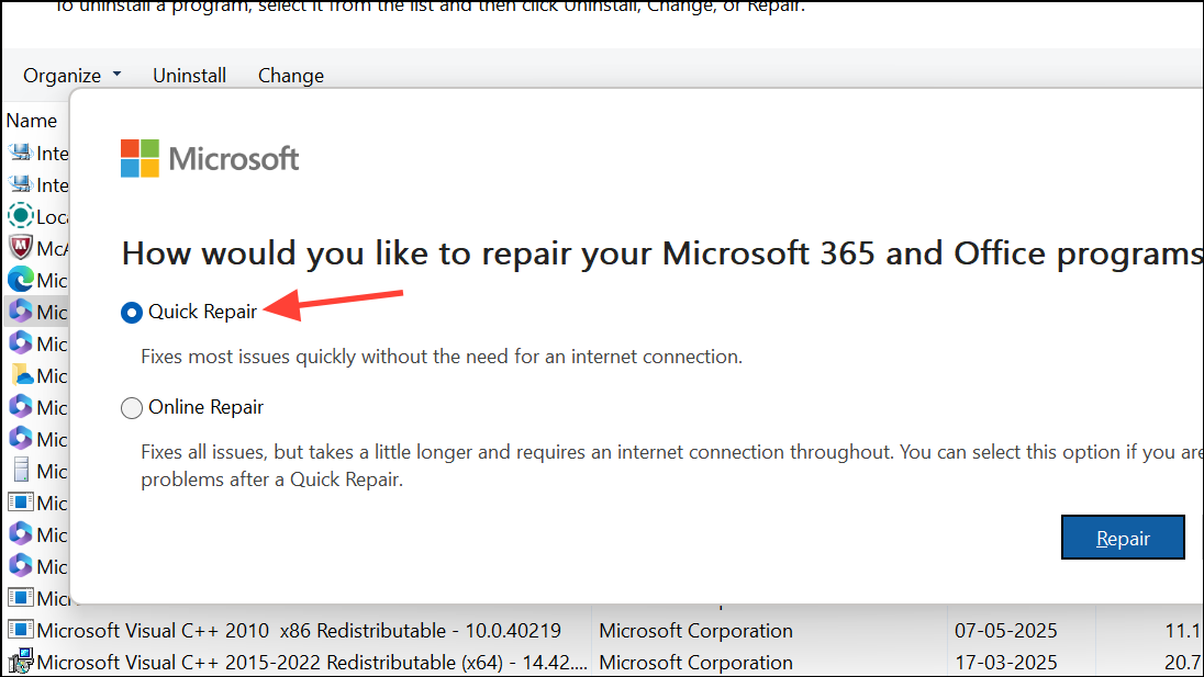 Step 4: Choose either Quick Repair or Online Repair and follow the prompts. Quick Repair is faster, but Online Repair is more thorough.