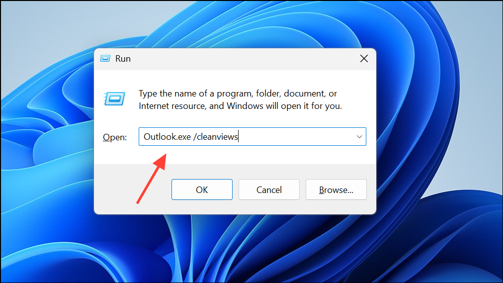 Step 3: Type Outlook.exe /cleanviews and press Enter. This command clears custom view settings.