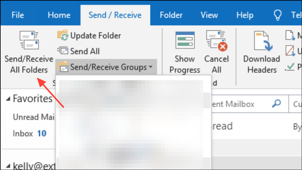 Step 2: In Outlook, go to the Send/Receive tab and click Update Folder or Send/Receive All Folders.