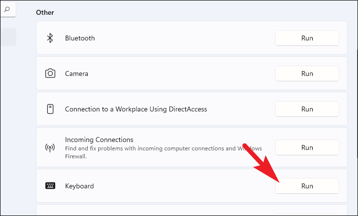 Step 5: Scroll down to the Other section and click the Run button next to Keyboard to start the troubleshooter.