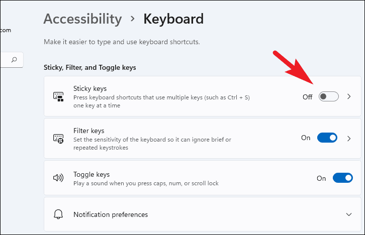 Step 4: Under the Sticky, Filter, and Toggle keys section, find the Sticky Keys option and toggle it to Off.